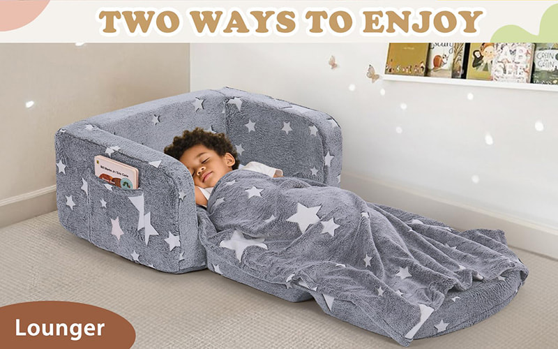 Functions as both a sofa and a lounger — simply flip it open to create a sleeper or play mat (typically extending up to 39 inches).
