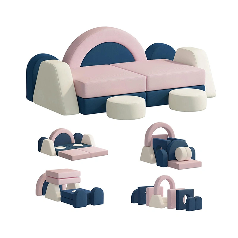This toddler modular sofa includes 12 pieces: 4 big square blocks, 2 circular blocks, 1 big arch block, 2 small semi-ellipses, 1 big semi-ellipse, and 2 trapezoids. Children can build a wide variety of creative play structures. They’ll have endless fun arranging the pieces into different shapes—perfect for stimulating imagination, creativity, and hands-on learning.