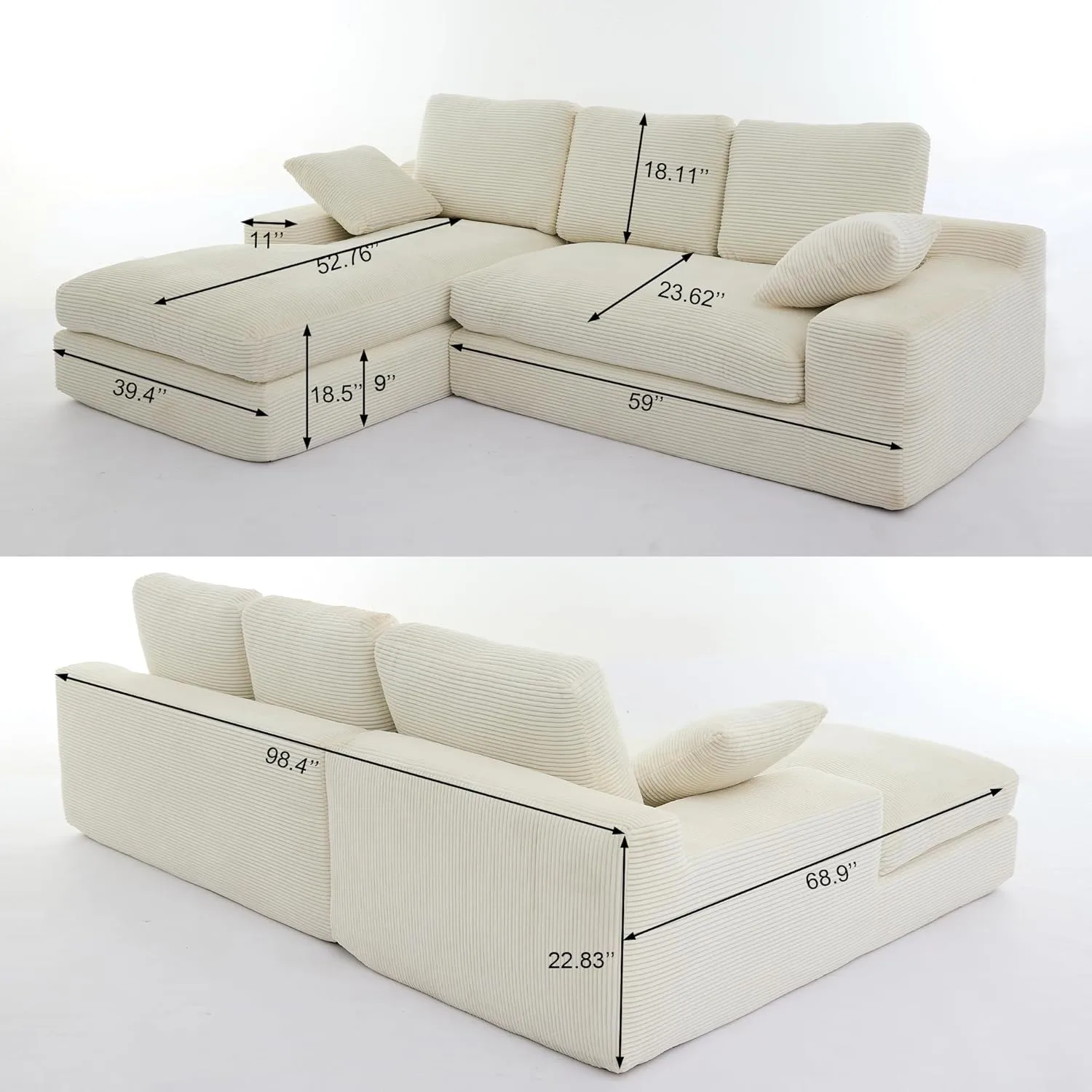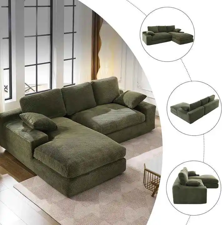 Discover this versatile modular L-shaped sectional sofa in wrinkle-resistant corduroy fabric. Enjoy thick, supportive cushions, sturdy seat frame, vacuum compressed packing, no assembly required, and endless configurations for modern, comfortable living.